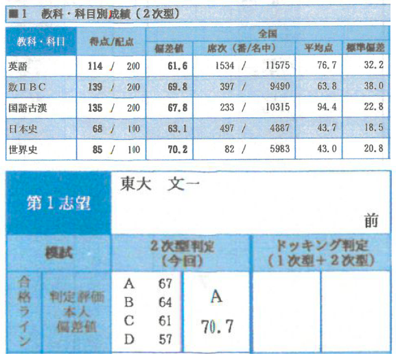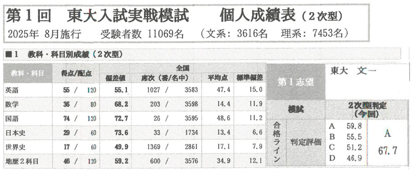 国語が一気に偏差値72.7まで上がり、日本史に関しても偏差値73.9まで急成長し、得意科目の数学よりできるようになってました。