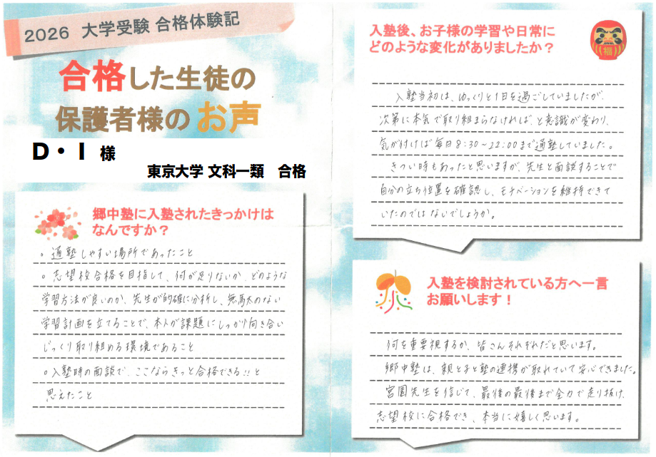 成績向上はもちろんですが、受験勉強を通して、自己の成長を感じながら知的好奇心を探究する楽しさを教えてくれました。